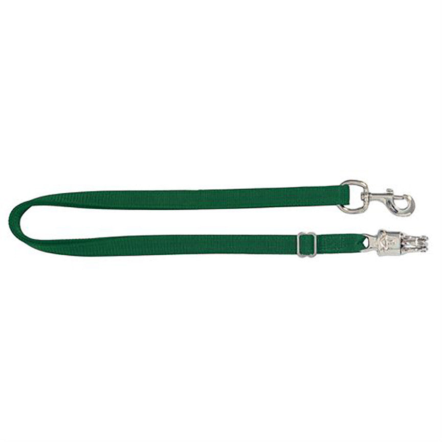 A safe, reliable and reusable method for tethering horses. Made of 1" heavyweight poly webbing with a malleable iron bull snap on one end and panic snap on the other end. The panic snap is designed to hold a horse under normal circumstances, yet release a panicky horse. This feature greatly reduces the risk of injury to horses and humans. Adjusts to 7' long.